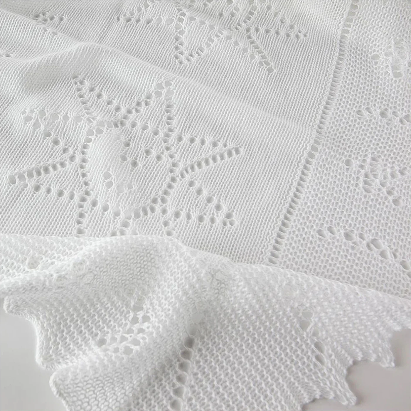Pure white 100% cotton baby shawl in distinctive stars and moon design with hand finished scalloped edge. Size: 122 x 120cm approx.