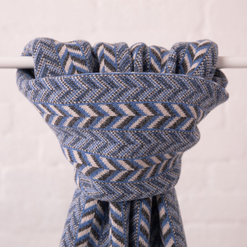 Keep warm this winter with our reversible geometric chevron scarf knitted in British spun 100% lambswool. Colour: Jeans Blue. Size: 188 x 27cm.