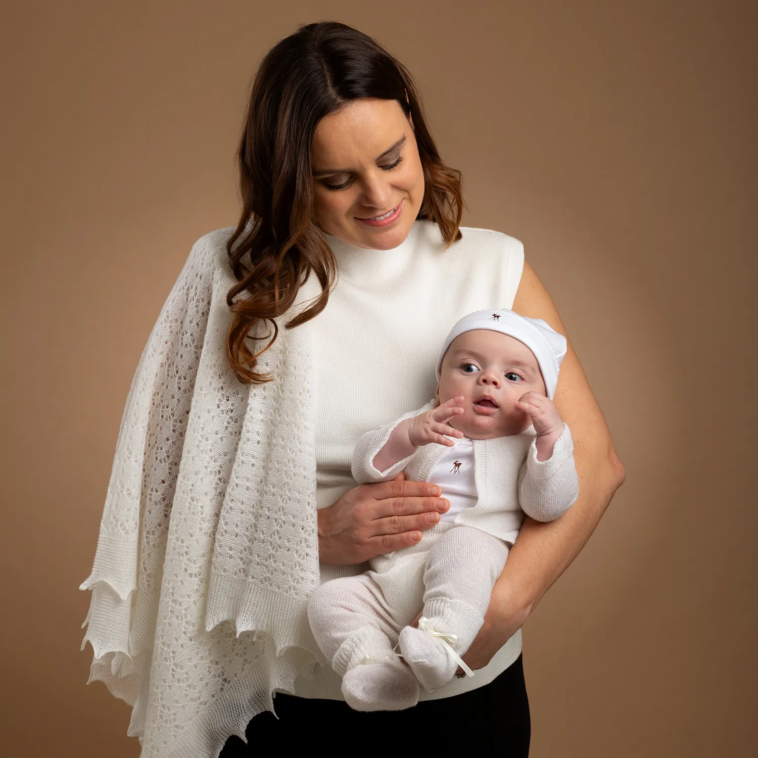 This adorable White Baby Cardigan, will keep baby warm and cosy with the gentle touch of 100% cashmere next to baby's soft skin. Beautifully made and hand finished in our historic shawl factory in Nottingham, England.